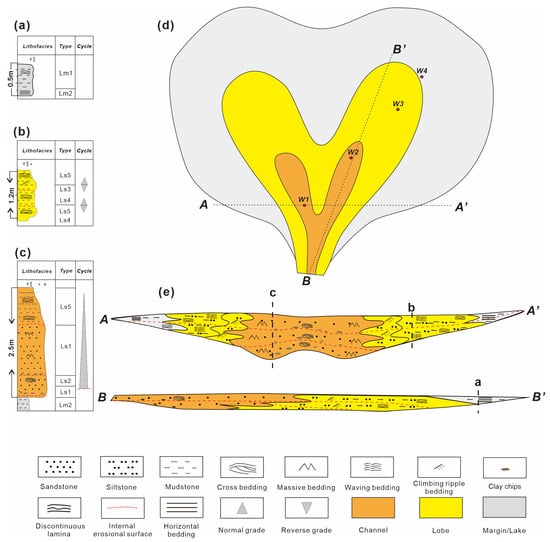 Sedimentary pattern of hyperpycnal flows in the Lucaogou Formation in the Jimusaer Sag, Junggar Basin. (a) Margin/lake longitudinal cross-section lithofacies assemblage sequence; (b) lobe longitudinal cross-section lithofacies assemblage sequence; (c) channel longitudinal cross-section lithofacies assemblage sequence; (d) facies planar distribution characteristics; (e) AA’ represents a section in the vertical direction of the source, and BB’ represents a section parallel to the direction of the source.