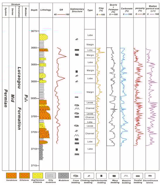 In the direction of provenance advancement, four wells were consecutively drilled from the southwest to the northeast in the central part of the Jimusaer Depression, resulting in a continuous well profile of Section 1 of the Lucaogou Formation (Figure 1b). The well samples were chosen based on their distance from the source, which effectively reflects changes in sedimentary subfacies. The stratigraphic information of the Permian for the four wells is provided in Table 1. Logging data from these wells (W1, W2, W3, and W4) were collected, including natural gamma-ray (GR), log lithology, nuclear magnetic porosity (35 ms), and sedimentary structures.