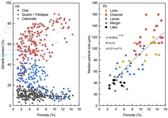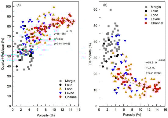 After identifying the impact of quartz and carbonate content on porosity in the Lucaogou Formation, we further analyzed the correlation between porosity and these two minerals across different microfacies sample points to better understand the favorable depositional subfacies for optimal reservoir formation. The results show a progressive decrease in quartz content and an increase in carbonate content from the channel to the lobe, natural levee, and margin-deep lake mud microfacies (Figure 14). In the channel, quartz content exhibits a significant positive correlation with porosity (Figure 14a), as the higher quartz content in coarser-grained sandstones leads to increased dissolution and intergranular porosity, thereby enhancing reservoir quality. Conversely, carbonate content in the channel shows a negative correlation with porosity (Figure 14b). It was suggested that carbonate cementation plays a key role in reducing porosity, thereby decreasing reservoir quality [7]. In contrast, porosity in the margins and lake is generally below 6% and does not show a significant correlation with mineral content (Figure 14).