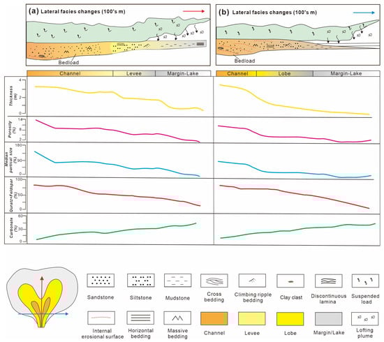 Channel-lobe, natural levee-margin, and lake depositional microfacies exhibit a close genetic relationship both vertically and laterally. Vertically, they form channel-natural levee-margin/lake deposits (Figure 15a), characterized by climbing ripple lamination, graded bedding, irregular lamination, and horizontal lamination. Laterally, in the direction parallel to the channel, they form channel-lobe-margin/lake deposits (Figure 15b), reflecting a shift in depositional mechanisms from bedload to suspended load to plume load. This sequence is interpreted as a sedimentary process where flood density current energy increases and then decreases. Consequently, sand bodies gradually thin, porosity decreases, quartz content declines, carbonate mineral content increases, and reservoir properties deteriorate.