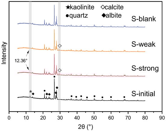 The XRD patterns of rock samples are shown in Figure 1. The main phases of the initial sample are quartz and albite, and the characteristic peaks are located at 20.8°, 26.6°, and 50.1° for quartz, and 22.1°, 27.7°, and 27.9° for albite. Meanwhile, XRD data indicates that the core contains a small amount of clay minerals, mainly kaolinite, and the characteristic peak is located at 12.3°. Due to the limitation of XRD detection, other mineral phases with lower content are not shown.