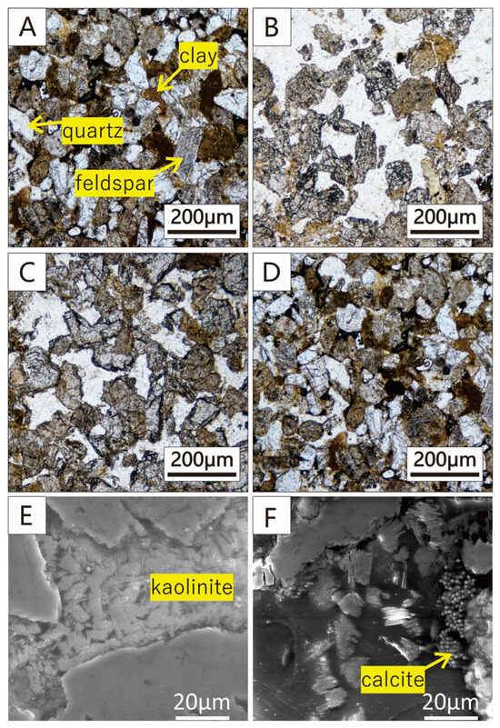 Morphology of the microstructure before and after the reactions. (A–D) The PM graphic of S-initial, S-strong, S-weak and S-blank; (E) kaolinite was filled in the pore of S-initial; (F) dissolved kaolinite and recrystallized calcite in S-strong.