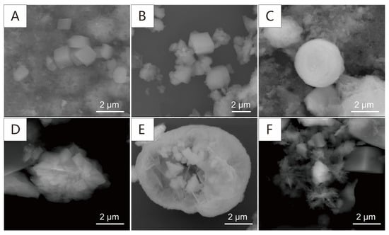 Secondary electron image of the scale. (A,B) The carbonate scale in S-weak and S-strong; (C,D) the silicate scale in S-strong; (E,F) the hydroxide scale in S-strong.