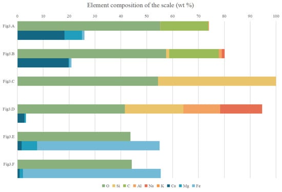 A large amount of silicate scale is found in S-strong, which is not apparent in S-weak. Figure 3C,D show their secondary electron images. Compared with the element content in Figure 4, we find that they are silicon dioxide and sodium silicate. The Raman shifts 123, 190, and 459 cm−1 in Figure 5C indicate the phase was quartz (SiO2) [30], and the Raman shifts 160, 442, 532, and 1037 cm−1 in Figure 5D correspond to natrolite (Na2(Si3Al2)O10·2H2O) [31]. The quartz is amorphous and exhibits low crystallinity. The natrolite belongs to zeolite minerals, with a low content after recrystallization. Consequently, they are not manifested in the XRD patterns. Similarly, the hydroxide scale can be found only in S-strong; as shown in Figure 3E,F, most of them are flocculated. The cations of the hydroxide mineral in Figure 3E are mainly iron and magnesium, and the weight percentages of the elements were 47.32% and 5.96%. In contrast, the weight percentages of Fe and Mg in the hydroxide mineral in Figure 3F were 53.23% and 1.26%. The different contents of Mg will lead to the different degrees of substitution of Fe in the lattice, which will cause the deviation of Raman peaks shown in Figure 5E,F. Previous studies also found that the scale phase is mainly carbonate, while other scholars found barite scale, and the mechanism of these scale formations has not been discussed in depth [32,33].