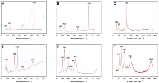 Raman spectroscopy of the scale. (A,B) The carbonate scale in S-weak and S-strong; (C) the recrystallized quartz in S-strong; (D) the recrystallized natrolite in S-strong; (E,F) the hydroxide scale in S-strong.