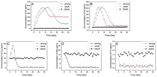 Within 30 days of the reaction, solution samples were collected for the ICP-AES test to study the variation patterns of the element Si, Al, Ca, Mg, and Fe in the fluid. In the process of rock–alkali interaction, when the dissolution rate is greater than the crystallization rate, the concentration of elements in the fluids will increase, and vice versa. When the two rates are consistent, the reaction is balanced and the element concentration will be stable. The concentration profiles of the five elements are depicted in Figure 6.