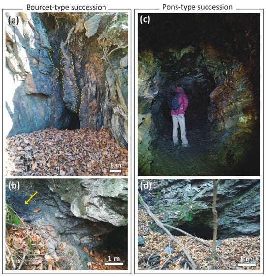 Access galleries to different mines in the Bourcet-type (a,b) and Pons-type (c,d) successions. (a) Timonsella Mine (Pramollo area): the yellow dotted lines delineate the graphitic seams within the graphite-free meta-conglomerates; (b) Garnier area: the exploration/exploitation gallery occurs in graphite-free meta-siltstones and meta-sandstones; a discrete graphitic horizon is exposed on the left side of the entrance (yellow arrow); (c) Gallery of the Pons Mine (Pomaretto area); the mineralization is hosted within graphitic meta-siltstones and metapelites; (d) Grandubbione area: the exploration/exploitation gallery is located within graphitic meta-sandstones and meta-siltstones.