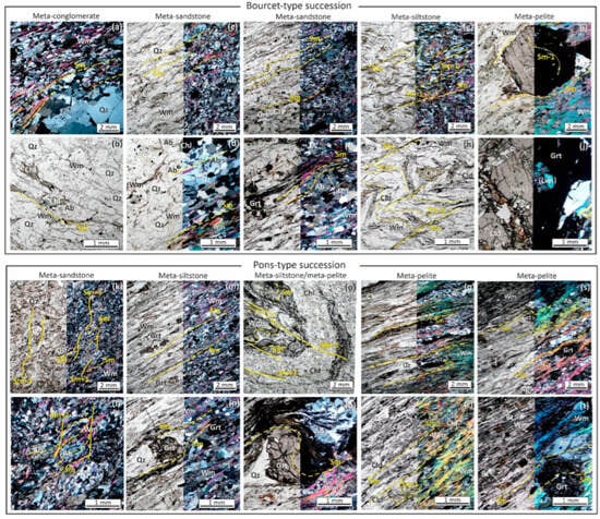 (a–j) Representative microstructures and mineral assemblages of the different lithologies from the Bourcet-type succession. The lithologies are ordered from the coarser-grained (meta-conglomerates: a,b) to the finer-grained (metapelites: i,j). (a,b) Meta-conglomerates: quartzitic clasts enveloped by the Sm defined by white mica and chlorite (a: DM1862, XPL; b: DM1863, PPL); (c–f) Meta-sandstones: Sm defined by white mica and chlorite (c,d) and details of albite with an internal schistosity continuous with the external Sm (d,f) (c: DM1865, PPL/XPL; d: DM1866, PPL/XPL; e,f: DM1879, PPL/XPL); (g,h) meta-siltstones: the Sm transposes an earlier foliation Sm−1 preserved in microlithons and defined by white mica, chlorite, and chloritoid (g: DM1868, PPL/XPL; h: DM1868, PPL); (i,j) metapelites: garnet porphyroblasts are enveloped by the Sm and include a rotated internal foliation defined by chloritoid and lawsonite (M1872, PPL/XPL). (k–t) Representative microstructures and mineral assemblages of the different lithologies from the Pons-type succession. The lithologies are ordered from the coarser-grained (meta-sandstones: k,l) to the finer-grained (metapelites: q–t). (k,l) Graphite-bearing meta-sandstones: the Sm is crenulated, with the local development of an Sm+1 axial-plane foliation; albite is synkynematic with respect to the Sm. The dotted white line in (l) highlights a small quartzitic clast (k: DM1897, PPL/XPL; l: DM1897, XPL); (m–p) meta-siltstones ± alternated with graphite-bearing metapelites; garnet is synkynematic with respect to the Sm and includes a rotated internal foliation (m,n: DM1881, PPL/XPL; o: DM1889, PPL; p: DM1880, PPL/XPL); (q,r) Graphite-bearing meta-pelite with microlithons preserving the Sm−1 defined by white mica, chlorite and chloritoid (DM1883, PPL/XPL); (s,t) graphite-bearing metapelites with alternating layers variably enriched in graphite; garnet and albite are synkynematic with respect to the Sm (DM1882, PPL/XPL). The dotted, dashed, and continuous lines define the Sm−1, Sm, and Sm+1 schistosities, respectively. PPL: plane-polarized light; XPL: crossed polarized light. Ab= albite; Chl = chlorite Gr = graphite; Grt = garnet; Ilm = ilmenite; Qz = quartz; Wm = white mica [85].