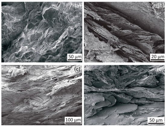 Morphology of graphite under high-resolution SEM-BSE photograms. (a,b) Representative graphite lumps from Bourcet-type succession: (a) massive graphite (Brutta-Comba Mine, Pramollo area); (b) thin graphite lamellae concretions (Timonsella Mine, Pramollo area); (c,d) representative graphite lumps from Pons-type succession: (c) deformed thin graphite lamellae concretions (Dubbione area); (d) graphite lamellae concretions (Inverso-Pinasca area). BSE: back-scattered electron images.