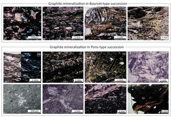 (a–d) Representative samples of graphite mineralization from the Bourcet-type succession: (a) Graphite graphite mineralization in meta-pelite; graphite exhibits poor schistosity (DM1873, PPL/XPL); (b) Pervasive pervasive schistosity (Sm) is defined by graphite, quartz, and white mica layers (DM1874, PPL); (c) Pervasive pervasive Sm overlaying a previous schistosity (Sm−1) in microlithons (DM1975, PPL); (d) Transition transition zone between high graphitic level and low-to-intermediate graphitic level. The Sm is highly crenulated. A second foliation Sm+1 is observable (DM1894; PPL). (e–l) Representative samples of graphite mineralization from the Pons-type succession: (e) Graphitic graphitic mica-schist. The Sm schistosity is defined by sub-millimetric layers of graphite alternated to quartz, white mica, and chlorite. Albite ocelli surrounded by Sm with discordant internal foliation (DM1880, PPL/XPL); (f) Graphite graphite mineralization. Sm is defined by pluri-millimetric graphite layers alternated to white mica, albite, and chlorite (DM1893, PPL); (g) Crenulation crenulation cleavage (Sm+1) overlaying Sm (DM1886, PPL); (h) Coarsecoarse-grained graphite tabular crystals with ilmenite inclusions (DM1892, PPL-RL); (i,j) Weathered weathered coarse-grained ilmenite in high-grade graphitic mineralization (DM1884, and DM1886, PPL-RL); (k,l) Chlorite chlorite and quartz veins cutting the Sm layers in graphite mineralization (DM1884, and DM1886, PPL). RL: Reflected reflected Lightlight; Ab = albite; Chl = Chlorite chlorite; Gr = Graphitegraphite; Grt = Garnetgarnet; Ilm = Ilmeniteilmenite; Qz = quartz; Wm = White white Mica mica [85].