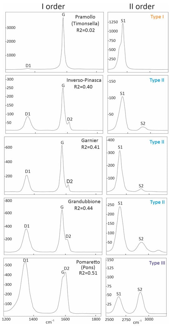 The Raman data allowed us to distinguish between three types of graphite based on the shape of their spectra (Figure 7) and, in more detail, on the relationships between the R2 parameter and the Full Width at Half Maximum (FWHM) of the graphite (G) band and the R1 parameter, both of whose shapes are very sensitive to the crystallinity of the carbonaceous material (Figure 8). The first graphite type (Type I) corresponds to graphite characterized by the presence of a sharp, high-intensity G peak with a low D1 peak in the first-order region and of a single sharp S1 peak in the second-order region (Figure 7), and by low values of R2 (from 0.02 to 0.23), R1 (from 0.02 to 0.11), and FWHM of the G band (from 15.60 to 17.75; Figure 8). This graphite derives only from the samples collected in the Pramollo area (Dormigliosi-Timonsella and West Siassiera Mines).