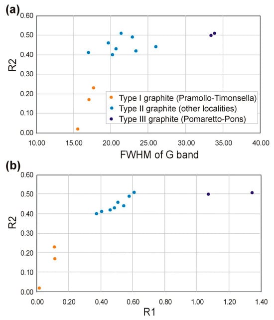 Relationships between the full width at half maximum (FWHM) of the graphite (G) band and the R2 parameter (a) and of the R1 and R2 parameter (b). In both diagrams, three types of graphite are distinguishable.