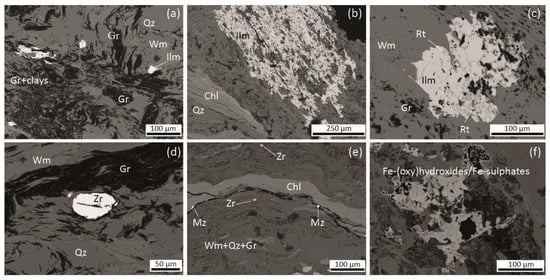 SEM-BSE photograms: (a) fine-grained graphite. Graphite is finely intergrown with clays (left-hand side). Accessory ilmenite (DM1875); (b) weathered ilmenite crystal. Chlorite + quartz vein on the left-hand side (DM1886); (c) Rutile relics as inclusions in Ilmenite (DM1874); (d) Detrital zircon (DM1875); and (e) accessory detrital zircons. Late chlorite vein parallel to Sm. Monazite seems to concentrate at the vein border (DM1893); (f) Fe-(oxy)hydroxides/sulfates in crusts. The phases developed for pyrite oxidation at the core of the crusts. In the figure, the pyrite is oxidized (DM1892). Chl = chlorite; Gr = graphite; Grt = garnet; Ilm = ilmenite; Mz = monazite; Qz = quartz; Rt = rutile; Wm = white mica; Zr =zircon [85].