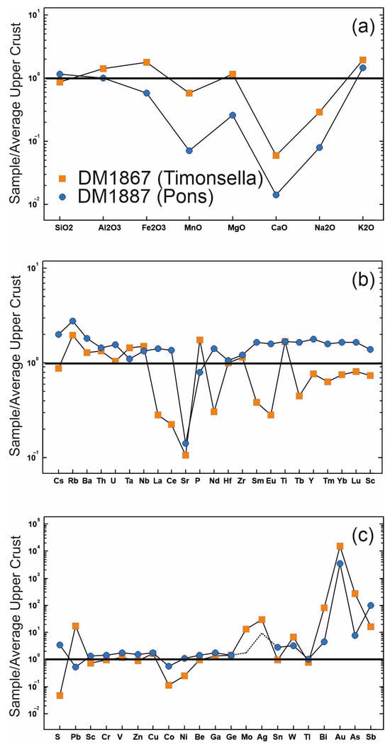 Bulk rock major (a) and trace (b,c) elements patterns for Pramollo (Timonsella) and Pomaretto (Pons) samples. The patterns are normalized to the average upper crust [89]. Data below detection limits are plotted as detection limit values without symbols and connected with dashed lines.