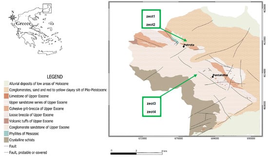 Four representative samples of zeolite-rich rocks (samples zeot1, zeot2, zeo3, zeot4) were collected from specific layers of the volcaniclastic deposits of Petrota of the Evros Region, in northern Greece (Figure 1). The basin of the Evros River, in the Greek territory, was shaped by Tertiary tectonic subsidence, which was formed by marginal faults in the massif of Rhodope. At the beginning of the Quaternary, the post-Alpine Thrace Basin was formed, unconformably over-lying the Alpine basement and filled with molassic sediments. The basement of the area consists of metamorphic rocks such as gneisses, chlorite-amphibolitic gneisses, and lens-shaped bodies of Mesozoic marble. These rocks are strongly deformed due to the Alpine orogeny [48,49,50,51].