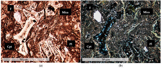 Representative photograph of zeolite-rich rock sample zeot3 under a polarizing microscope. Cpt: Clinoptilolite, F: K-Feldspar, Pl: Plagioclase, Mica, (a) N//, (b) N⊥.
