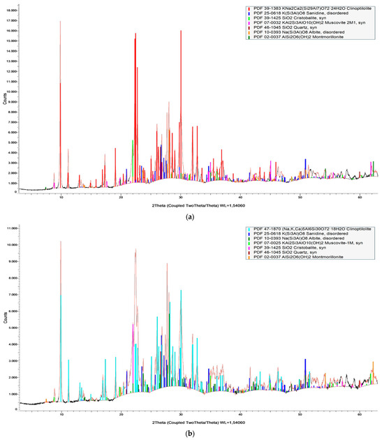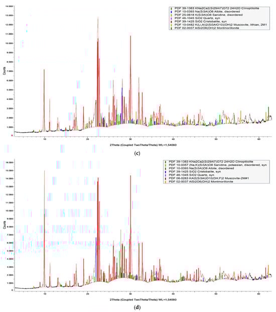 According to Cook et al. [65] and Moore and Raynolds [66], the qualitative analysis of the examined samples was evaluated using the database of ICDD PDF4+ (PDF2023-2024) provided by Bruker. In detail, the zeolite content, characterized as clinoptilolite, was determined by the characteristic peak at d-spacing ~9.9 Å, micas from the peak at d-spacing at 4–12.6° 2θ, K-feldspars from the peak at d-spacing at 3.26–3.21, feldspars from the peak at d-spacing at 3.21–3.17 Å, quartz from the peak at d-spacing at 4.26 Å–3.34 Å–1.81 Å, and cristobalite from the peak at d-spacing at 4.15 Å.