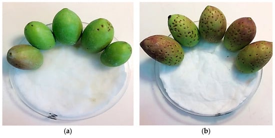 Oviposition deterrent effect of zeot3 on females of the olive fruit fly. Olive fruits were maintained in cages with 5 adult females of the olive fruit fly for 8 days at 25 °C and 16L:8D. The black spots on the surface of the fruits are the oviposition holes on (a) olive fruits treated with zeot3, (b) control (non-treated olive fruits).