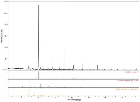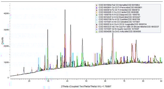 Reduced red mud powder samples were analyzed at room temperature by the X-ray powder diffraction technique. All obtained powders were identified using the ICDD database at https://www.icdd.com (accessed on 20 March 2025).