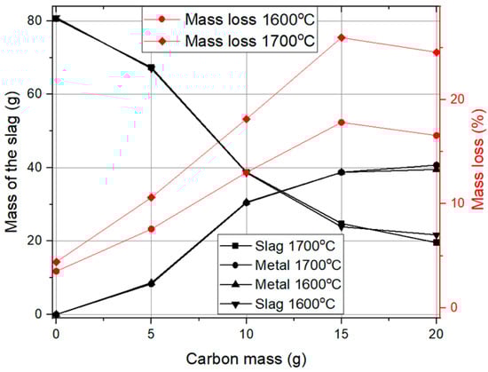 Mass loss and the mass of the slag and metal dependence on the carbon mass.