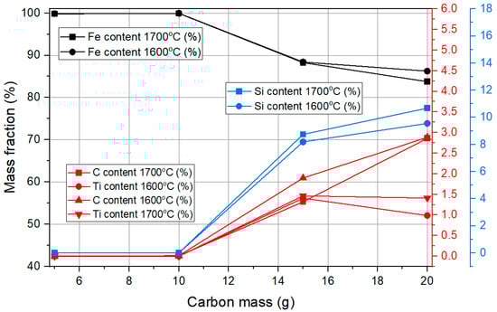 The Figure 3 illustrates the composition of alloying elements in iron during carbothermal reduction. At lower carbon mass values between 5 and 10 g, iron dominates with a content close to 100%. However, with an increase in carbon mass beyond 15 g, there is a significant rise in the content of other elements in the metal phase. Silicon content increases notably, reaching values up to 11%, while titanium and carbon contents also show substantial growth. The presence of carbon in the metal phase suggests an excess amount beyond what is needed for reduction. Temperature plays a significant role in this process, with higher carbon content leading to a greater incorporation of impurities. At 1700 °C, the content of all alloying elements in iron is higher compared to 1600 °C, indicating that increased temperature enhances impurity dissolution. This suggests that a carbon mass above 10 g leads to excessive impurity formation, which may not be desirable for obtaining high-purity iron.