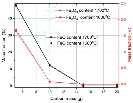 During the reduction process, Fe2O3 is firstly reduced to FeO, and with the increase in reducing agent mass, it is further reduced to metallic Fe [32]. After the reduction process, there are two phases: slag, which is low in Fe, and the metal Fe phase. The carbothermal reduction of oxides from red mud was calculated and shown in Figure 2.