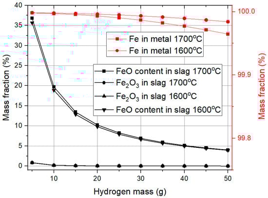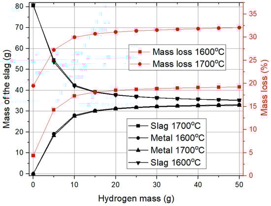 Mass loss exhibits a similar pattern. With the hydrogen mass increase, oxygen from iron oxide reacts with hydrogen to form water vapor. Up to 20 g of hydrogen, mass loss increases significantly, but beyond this point, the effect becomes less significant, suggesting that most reducible oxides have already been removed. Temperature variation from 1600 °C to 1700 °C does not greatly influence slag reduction or metal formation, but it does have a noticeable effect on mass loss. At 1700 °C, mass loss is higher, likely due to enhanced reaction rates and increased volatilization of reaction byproducts.