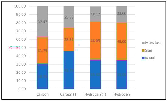 Figure 5 shows the influence of hydrogen mass on slag mass and mass loss during the reduction process. Initially, with no hydrogen present, the system is entirely composed of red mud, resulting in the maximum slag mass. As hydrogen is introduced, reduction reactions take place, leading to a notable decrease in slag mass and a corresponding increase in metal formation. This effect is most significant for up to 20 g of hydrogen, beyond which additional hydrogen has little impact on further reducing the slag or increasing metal yield, proving that the reaction is almost complete.