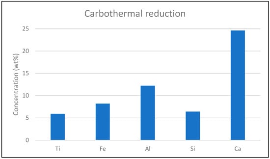 This Figure 8 shows the results of ICP analysis and composition (in weight percentage, wt%) of various elements, such as iron (Fe), titanium (Ti), silicon (Si), aluminum (Al), and calcium (Ca), in the slag after carbothermal reduction. The high concentration of calcium, approaching 30%, reflects the addition of CaO as a flux agent during the process. Compared to the original red mud, which contained a very low amount of calcium, the introduction of CaO significantly increases its concentration in the reduced slag. Aluminum also shows an increase in concentration, slightly above 10%. The concentration of iron is reduced to between 10% and, 5%, representing a successful reduction of iron oxides. Silicon and titanium are also significantly enriched in slag due to the inertness of this reducing agent. This figure highlights the impact of adding CaO as a flux agent, showing that it became dominant in the slag.