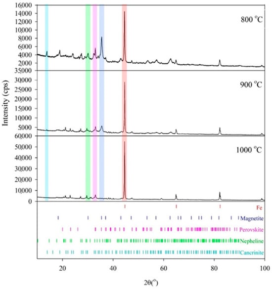 Diffractograms for three red mud samples reduced in a hydrogen atmosphere at 800, 900, and 1000 °C are shown in Figure 12. The identified phases include metallic iron, magnetite, perovskite, nepheline, and cancrinite.