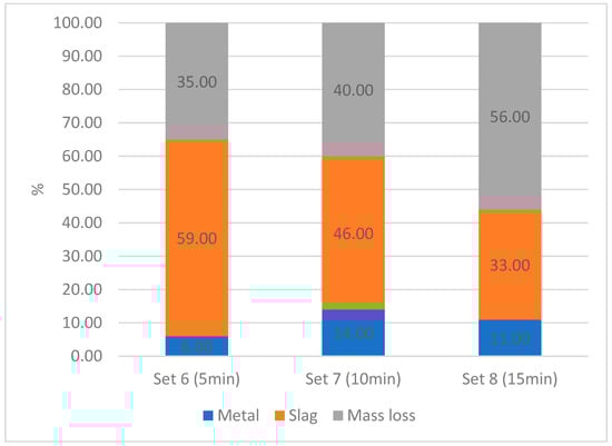 Figure 13 illustrates the mass balance observed during the plasma-thermal reduction process. Mass losses of up to 56% were achieved, a portion of which could be attributed to the reduction of oxides to metals, primarily aiming to produce a metallic iron phase and remove iron from the slag. However, analysis indicates that a significant part of the mass loss is not solely due to the reduction reaction but may also be caused by other factors, like moisture in the feed material, losses during handling, and dust or evaporation during the experiment. Figure 13 shows the highest amount of the metallic phase obtained with a 10 min reaction time, suggesting that it can be optimal for these parameters. The various results in mass loss for different experiments indicate potential dependence on unknown factors, like parameter fluctuations or inhomogeneous feed material.