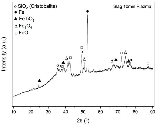XRD analysis of a plasma thermally reduced red mud slag after 10 min of reduction time.