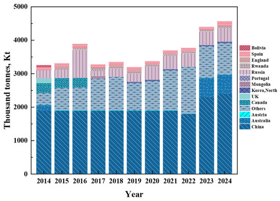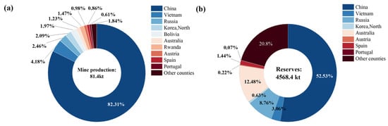 - Wang, X.; Qin, W.-Q.; Jiao, F.; Dong, L.-Y.; Guo, J.-G.; Zhang, J.; Yang, C.-R. Review of tungsten resource reserves, tungsten concentrate production and tungsten beneficiation technology in China. Trans. Nonferrous Met. Soc. China 2022, 32, 2318–2338. [Google Scholar] [CrossRef]