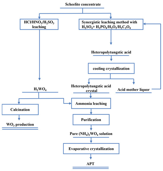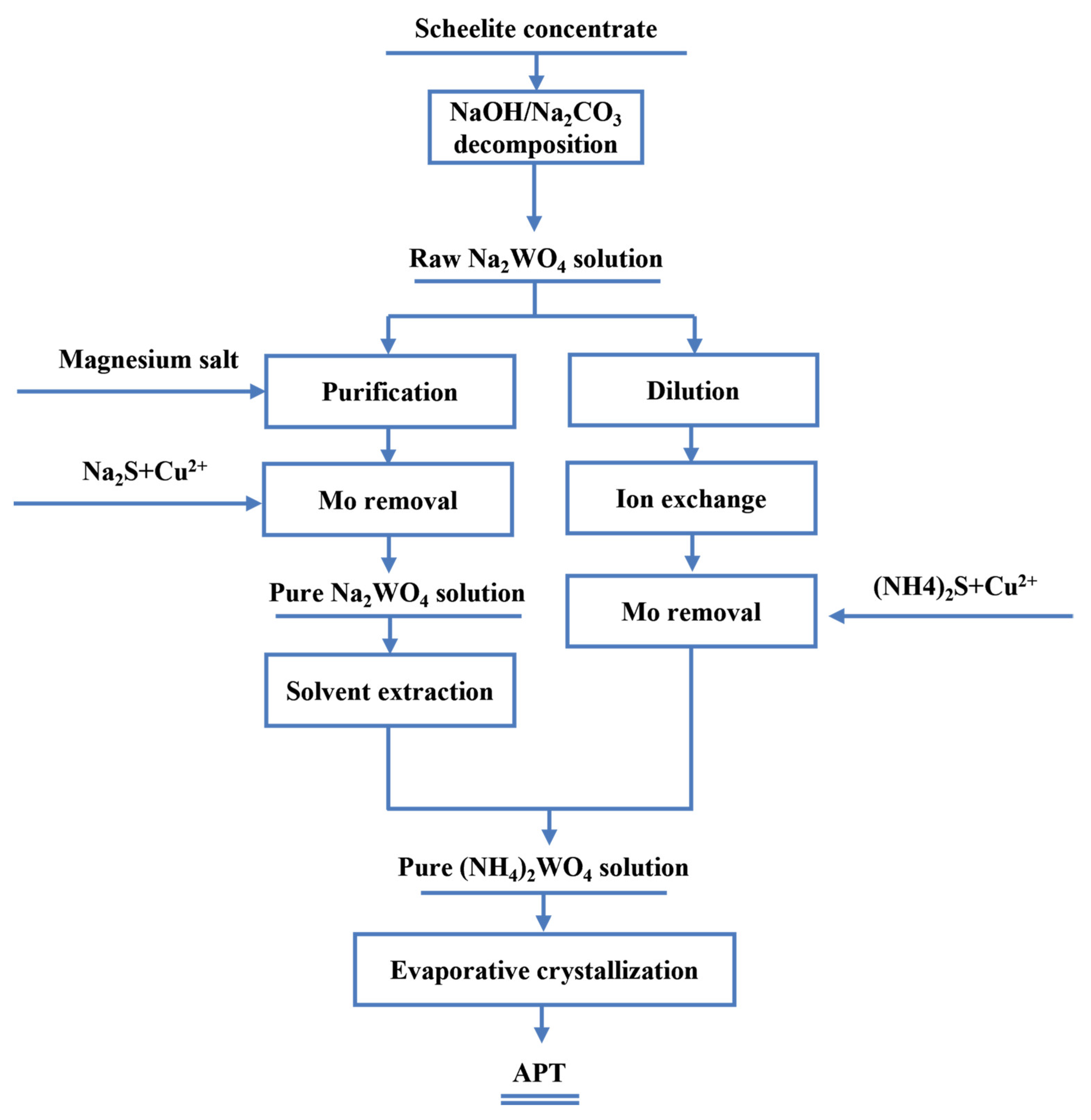 - Chen, Y.; Huo, G.; Guo, X.; Chen, J. A review of flowsheets for tungsten recovery from scheelite, wolframite and secondary resources and challenges for sustainable production. Hydrometallurgy 2025, 234, 106455. [Google Scholar] [CrossRef]