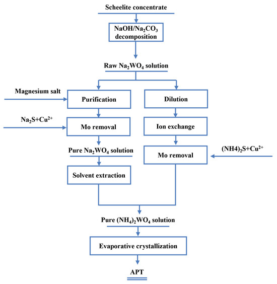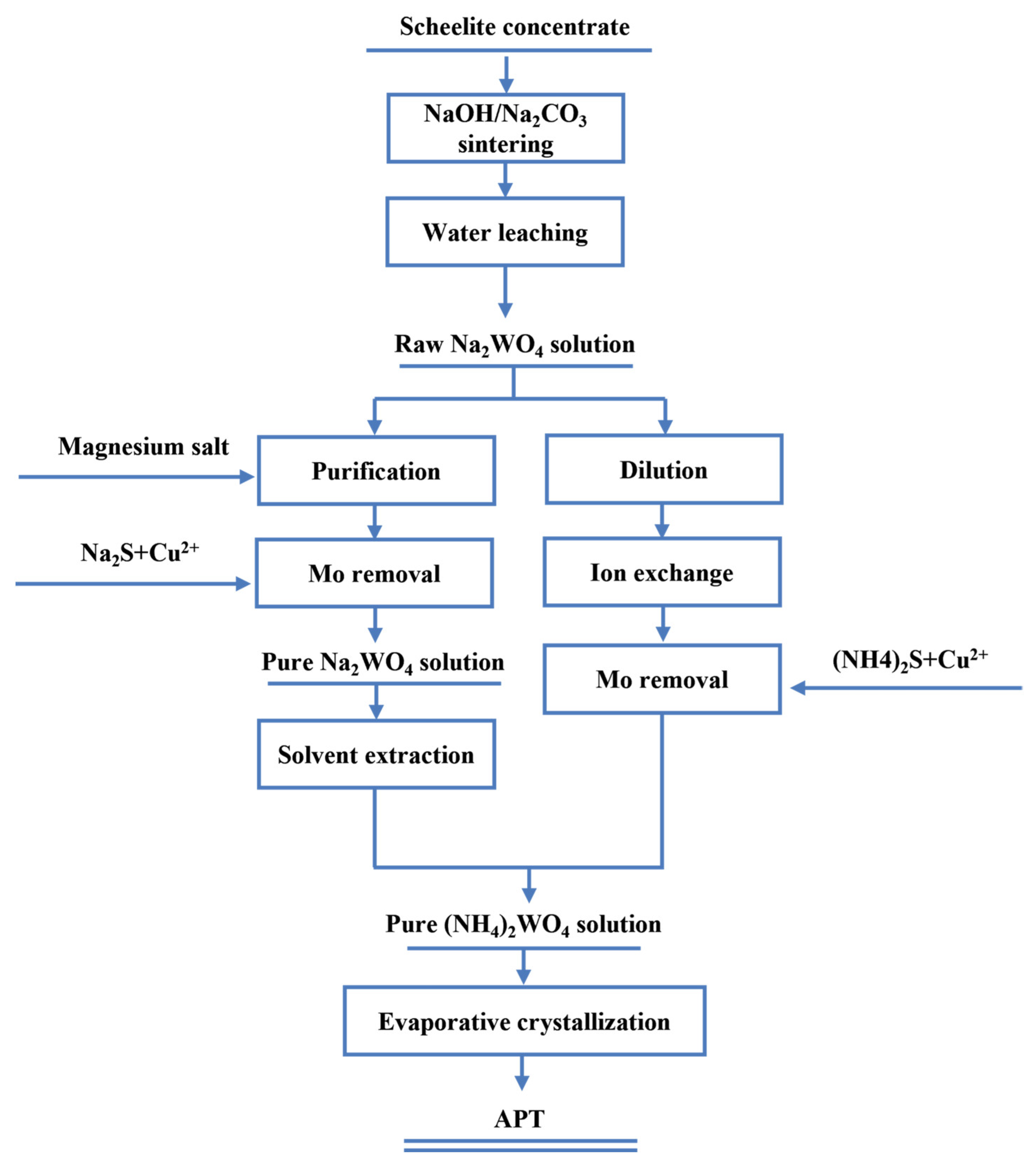 - Lassner, E. From tungsten concentrates and scrap to highly pure ammonium paratungstate (APT). Int. J. Refract. Met. Hard Mater 1995, 13, 35–44. [Google Scholar] [CrossRef]