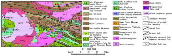The strata in the study area are as follows: In the northern Qinling Orogenic Belt, the main exposure is the ancient and metamorphic Qinling Group (Pt1Q), which is a set of metamorphic rocks with a degree of metamorphism reaching the amphibolite facies, and it is a terrestrial clastic rock–carbonate rock construction. In the northern part of southern Qinling, the thrust–overthrust structure zone comprises a transitional metamorphic and deformed basement from the Middle to Late Precambrian, and the Neoproterozoic Yaolinghe Formation (Pt31−2y) comprises a set of shallow metamorphic marine volcanic lava-volcanic clastic rock and tuff. The cover layer is mainly composed of the Cambrian–Ordovician Doushantuo Formation (Z2Є1d), which is mainly a terrestrial clastic rock, mudstone, and carbonate rock sedimentary construction; the Dengying Formation (Z1Є1ds) is dolomitized marble interlayered with dolomite; the Dongpo Formation (Z2d) is composed of calcareous quartz sandstone and interbedded with conglomerate shale; the Early Paleozoic Cambrian–Ordovician Shiwengzi Formation, Bailongdong Formation, and Liangchakou Formation (Є3O3sw-l) are mainly composed of dolomite, argillaceous dolomite, and other carbonate rocks; the Shuikou Formation (Є3s) and Shuigoukou Formation (Є3O1sw) are generally composed of black siliceous rock and carbonaceous slate; the Shuigoukou Formation, Yuejiaping Formation, and Shiwengzi Formation (Є1O1s-sw) are mainly composed of carbonate rocks and clastic rocks; the Silurian Daguiping Formation (S1d) is mainly composed of carbonaceous quartzite, garnet biotite quartzite interlayered with siliceous crystalline limestone; the Meiziya Formation (S1–2m) is mainly composed of black cloud variegated quartzite, staurolite biotite quartzite interlayered with limestone; and the Zhouqu Formation (S2z) is mainly composed of feldspathic sandstone, carbonaceous slate, sandy slate, and mixed sedimentation. The Devonian strata are widely exposed in the study area, with them belonging to a marine terrestrial clastic–carbonate construction, composed of clastic rocks and carbonate rocks, mainly including the lower-middle Devonian Xichahe Formation (gravel and conglomerate); Gongguan Formation (sandy dolomite and dolomite interbedded with slate) (D1–2x-g); the middle Devonian Dafengou Formation (D2d) dominated by iron and calcium sandstone interbedded with slate and limestone; the Niuerchuan Formation (D2n) dominated by quartz sandstone interlayered with sandy slate and dolomite; the Chigou Formation (D2c) mainly composed of mudstone and striped sandstone; the middle and upper Devonian Qingshiya Formation (D2–3q) dominated by calcareous siltstone, sericite silty slate, sandstone, and marl; the upper Devonian Xinghongpu Formation (D3x) dominated by sandstone and sandy slate interlayered with limestone; and the Gudaoling Formation (D3g) mainly containing limestone, reef limestone, and bioclastic limestone. The Devonian–Carboniferous mainly comprises the Jiuliping Formation (D3C1j) slate interlayered with conglomerate, limestone, and (silt) sandstone. The Mesozoic Donghe Group (K1D) is only exposed in the northern part of the Shangdan Fault Zone and is mainly composed of conglomeratic sandstone and conglomeratic sandstone (Figure 2) [31,32].