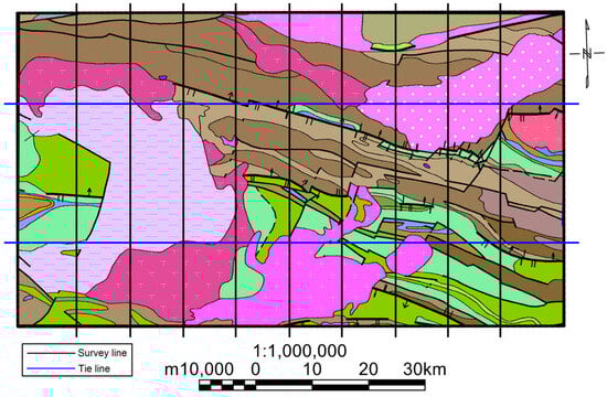 The main geological structures in the research area are predominantly oriented in a near east–west or northwest–southeast direction. Following the principle of setting survey lines as perpendicular as possible to the direction of the geological structures [34], the primary survey lines in the research area were determined to be oriented north–south (0–180°), with a line spacing of 500 m. Tie lines were set to be perpendicular to the primary survey lines, oriented east–west (90–270°), with a flight line spacing designed to be 7.5 km, based on the principle of the aircraft flying at normal cruising speed for 2–5 min. The measurement scale was 1:50,000. The schematic diagram of the survey network layout in the study area is shown in Figure 3.