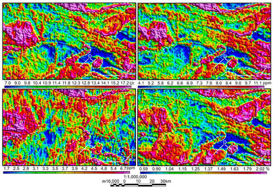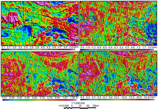 The total count of airborne radioactivity can reflect the overall strength of radioactivity in different rock formations. As shown in Figure 4a, the study area generally exhibits a high radioactive background, with a banded or patchy distribution. High anomaly areas are located within the Shandan Fault Zone (A), the outcrop area of Triassic mixed granites (γmiT) (B), the southern edge of Middle Jurassic quartz diorites (ηoJ2) (C), the outcrop area of Late Triassic diorite granites (ηγT3) (D), and the outcrop area of Silurian strata at the southeastern edge of the study area (E). Weak anomalies are mainly located in the interbedded areas of the Early Paleozoic Cambrian–Ordovician Shuigoukou Formation, the Shiwengzi Formation, the Bailongdong Formation, and the Liangchakou Formation (Є3O3sw-l, Є3O1s-sw). The distribution characteristics of these radioactive anomalies reflect that in areas with intense magmatic activity, the regions where intermediate–acidic volcanic rocks are exposed exhibit higher radioactivity backgrounds, forming patchy high radioactive anomaly areas. The high radioactivity content in the Silurian strata in the southeast of the study area is mainly due to the presence of carbonaceous black rock formations with a higher degree of metamorphism. The background field within the area mainly corresponds to the outcrop areas of Late Paleozoic Devonian strata.