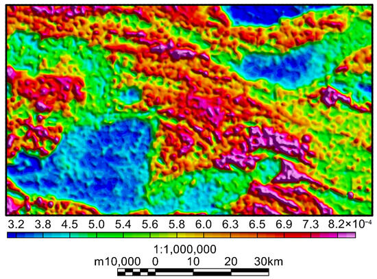 Due to the secondary enrichment of potassium and significant loss of thorium in liquid form during alteration processes, the thorium–potassium ratio is commonly used to determine the degree of alteration in rocks [35]. Research has shown that a decrease in the eTh/K ratio, with a minimum value less than 2 (typically greater than 3 in intrusive and sedimentary rocks), indicates geochemical uniformity in the area and suggests the presence of altered rocks at potassium anomalies [36]. As shown in Figure 5, the alteration processes in the study area are mainly concentrated in the exposed areas of the Precambrian Qinling Group north of the Shangdan Fault Zone, the western part of the Middle Jurassic quartz diorite (ηoJ2), and the exposed areas of the Late Paleozoic quartz syenite (δoPz2).