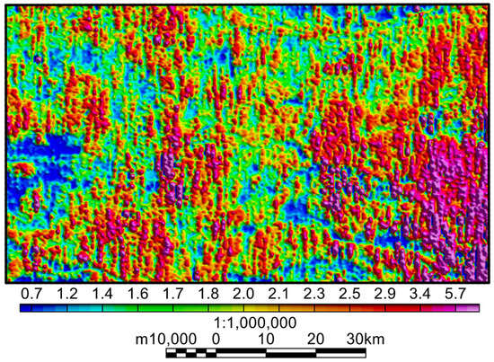 In the study by B.B. Sherbinna (1941), the eTh/eU ratio generally ranges from 3.5 to 3.3. When the eTh/eU ratio of a rock mass is between 2.0 and 0.7 (often 0.7), it typically forms a uranium ore deposit; when the ratio is between 2.5 and 4.0, it forms a uranium–thorium mixed ore deposit; and when the ratio is greater than 5.0 to 8.0, it forms a thorium ore deposit [37]. The thorium–uranium ratio in the exposed areas of the Triassic mixed granite (γmiT) and the Silurian strata in the study area ranges from 0.3 to 3.7, indicating a potential formation of uranium ore deposits. The average thorium–uranium ratio for the entire area is 3.15, suggesting that uranium mineralization in the study area is mainly associated with uranium and thorium coexistence (Figure 6). The thorium–uranium ratio is also commonly used to analyze the general rules of sedimentary environments and facies: when eTh/eU is less than 2, this generally indicates a deep-water sedimentary environment under strong reducing conditions, often resulting in gray or green shales; when 2 < eTh/eU < 7, it belongs to a transitional environment from reducing to oxidizing, such as coastal or littoral sedimentary environments; when eTh/eU is greater than 7, this indicates an oxidizing environment, typically associated with continental sedimentation [38,39]. Various sedimentary environments are reflected in the study area.