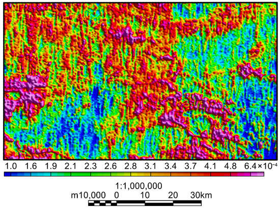 The collected aeromagnetic gamma-ray spectrometry data were subjected to correction for aircraft background, cosmic ray background, atmospheric radon, Compton scatter (stripping coefficient correction), and altitude attenuation. The corrected window count rate was used to calculate the ground concentrations of 40K, 238U, and 232Th nuclides, with uranium and thorium concentrations expressed as eU and eTh, respectively, in parts per million (ppm). Potassium content was expressed as K, in percentage. The total window count rate was converted into equivalent uranium content, known as the unit of radiation (Ur).