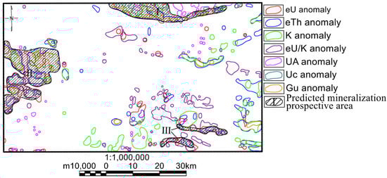 Based on the above analysis of ore-forming conditions, high-value anomalies in uranium content (>9.77 ppm), thorium content (>13.56 ppm), potassium content (>2.57%), and uranium–potassium ratio (>7.41 × 10−4), along with high-value anomalies in the uranium abundance coefficient (>1.88 ppm) and uranium migration enrichment coefficient (>114.94 ppm) identified through weak information enhancement extraction, located within zones of positive uranium migration (i.e., late uranium migration zones), were delineated. The exclusion criteria included water bodies, Quaternary zones, and altitudes exceeding 180 m. High-value anomalies were selected based on three times the standard deviation above the regional mean. Based on the selected anomalies from airborne gamma-ray spectrometry parameters, areas with the richest comprehensive anomaly information were circumscribed as prospective mineralization zones, with a total of three prospective zones (Zones I to III) being identified within the study area, as detailed in Figure 9.