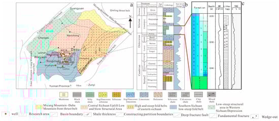 Regional geological setting of the study area. (a) Structural framework of the Sichuan Basin and the study area. (b) Generalized stratigraphic framework of the Sichuan Basin. (c) Composite lithostratigraphic architecture of the Wufeng–Longmaxi succession in the Southern Sichuan Basin sector.