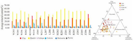 Mineral composition bar charts of wells and shale sample ternary diagrams for the Wufeng Formation-Long 1-1 Sub-member in the Neijiang–Rongchang Block.