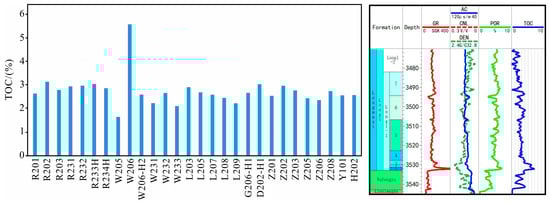 TOC analysis of multiple samples (Wells R232, W219, R239, Z201, W210, L208, etc.) was performed at PetroChina Southwest Oil & Gas field Company’s Analytical Center. Measurements utilized a KLT-005 carbon/sulfur analyzer under controlled conditions (14–16 °C, 42% RH), adhering to GB/T 19145-2022 standards [25].