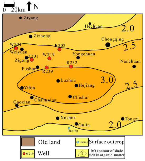 Core samples were collected from over 20 wells (including L208, W210, and Z201) in the Neijiang–Rongchang region, from which more than 50 shale samples were obtained for experimental analysis. These samples underwent comprehensive analyses including field emission scanning electron microscopy (FE-SEM), thin-section petrography, total organic carbon (TOC) quantification, X-ray diffraction (XRD), low-temperature N2/CO2 adsorption–desorption tests, kerogen microcomponent identification, vitrinite reflectance measurement, and rock pyrolysis.