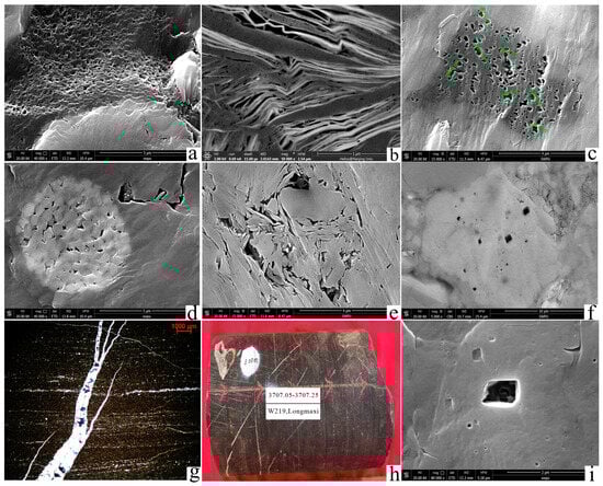 Mineral composition and lithofacies architecture fundamentally control reservoir space abundance and high-quality reservoir distribution. Shale mineralogy governs fracture development, pore architecture, and fracture-filling mineralogy [45]. The lower Wufeng Formation–Long1-1 Sub-member features quartz-rich intervals (>40% total quartz content), with biogenic quartz accounting for >50% of silica, confirming predominant biogenic origins [46]. These siliceous shale facies, developed in organic-rich siliceous mud shelf environments, exhibit synergistic pore-fracture networks comprising microfractures, pyrite intercrystalline pores, and organic-hosted pores (Figure 5a–i).
