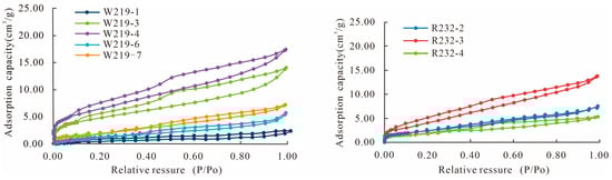 The experiment was conducted at the National Key Laboratory of Oil and Gas Reservoir Geology and Exploitation, Chengdu University of Technology, China. Pore structure characterization of 9 samples in Well R232 was completed using a Quantachrome NOVA2000e analyzer, Quantachrome Instruments, Boynton, FL, USA. Low-pressure N2 (77 K) and CO2 (273 K) adsorption isotherms were acquired to assess mesopore and micropore distributions.