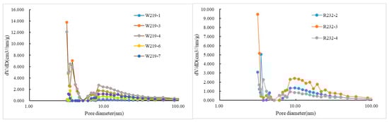 The multiple data sets of three wells in the Wufeng Formation–Long1-1 Sub-member within the study area were tested by low-temperature nitrogen adsorption and carbon dioxide adsorption methods. The nitrogen adsorption–desorption isotherms indicated that the isotherm shapes were more inclined to be reverse “S” type, which demonstrated the porosity of the Wufeng Formation–Long1-1 Sub-member shale [43]. Moreover, the increase in the adsorption loop area and the gradual convergence of some adsorption and desorption curves suggested that the shale in this section was mainly composed of mesopores. According to the classification of isothermal adsorption curves by previous researchers, it can be concluded that these shales were mainly composed of slit-like, plate-like, and lamellar pores. The N2 adsorption/desorption isotherms also confirmed this (Figure 6) [44]. The pore size distribution curve obtained from the BJH model based on the low-temperature nitrogen adsorption data clearly showed that the peak values of the samples in the study area mainly occurred in the 3–5 nm range, but were mainly distributed in the 5–50 nm range (Figure 7). The conclusion obtained was consistent with that from the adsorption test, indicating that the pores of the shale were mainly mesopores. Moreover, the number of pores in the lower section of the reservoir (Wufeng Formation–Long1-1 Sub-member) within the study area was higher than that in the upper section (Long1-15 sub-layers–Long1-17 sub-layers). The pore volume of the study section within the area, calculated by the BET model, ranged from 0.003019 m3/t to 0.03444 m3/t, and the specific surface area ranged from 1.568 m2/g to 31.187 m2/g. The pore volume of the lower section of the reservoir in the southern Sichuan area was significantly higher than that of the upper section, and the specific surface area showed the same trend as the pore volume (Figure 8).
