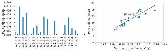 Pore volume distribution characteristics from different well locations and specific surface area vs. pore volume relationship of shales in the Wufeng Formation–Long1-1 Sub-member, Neijiang–Rongchang Block.